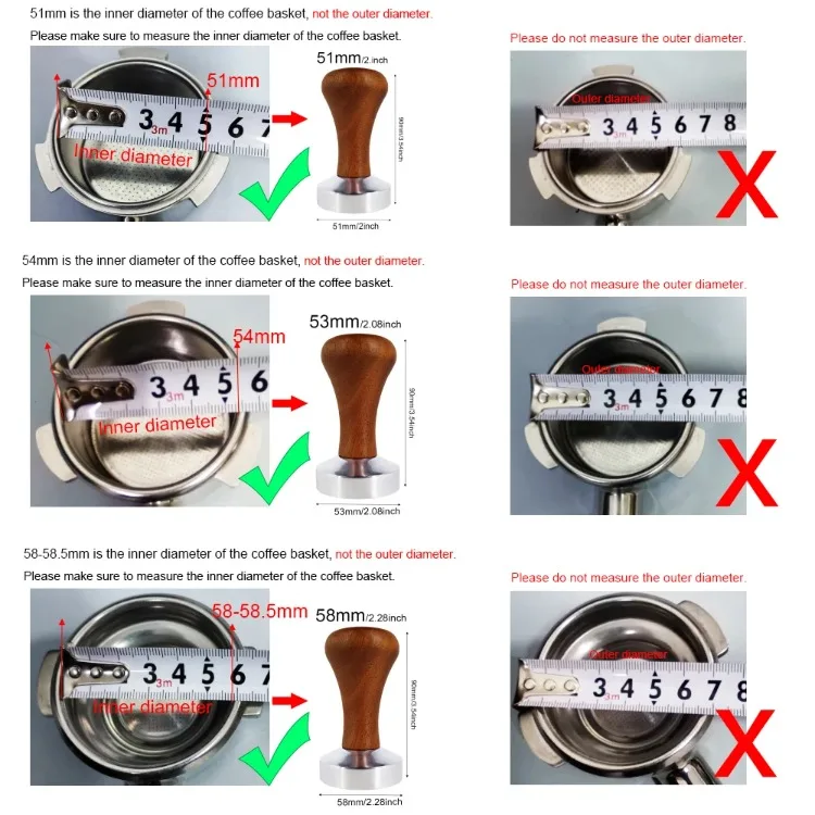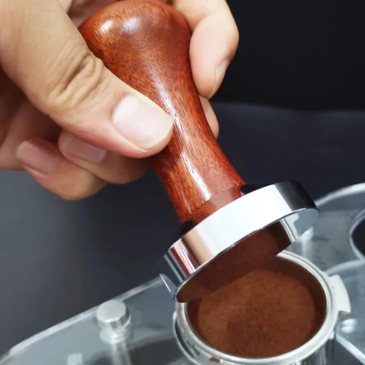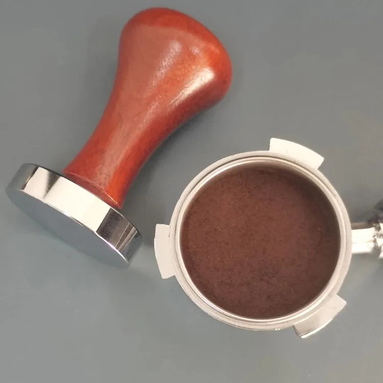 Durable espresso tamper with aluminum base and wood handle, available in 51mm, 53mm, and 58mm sizes. Ideal for compacting coffee grounds evenly for consistent espresso extraction.